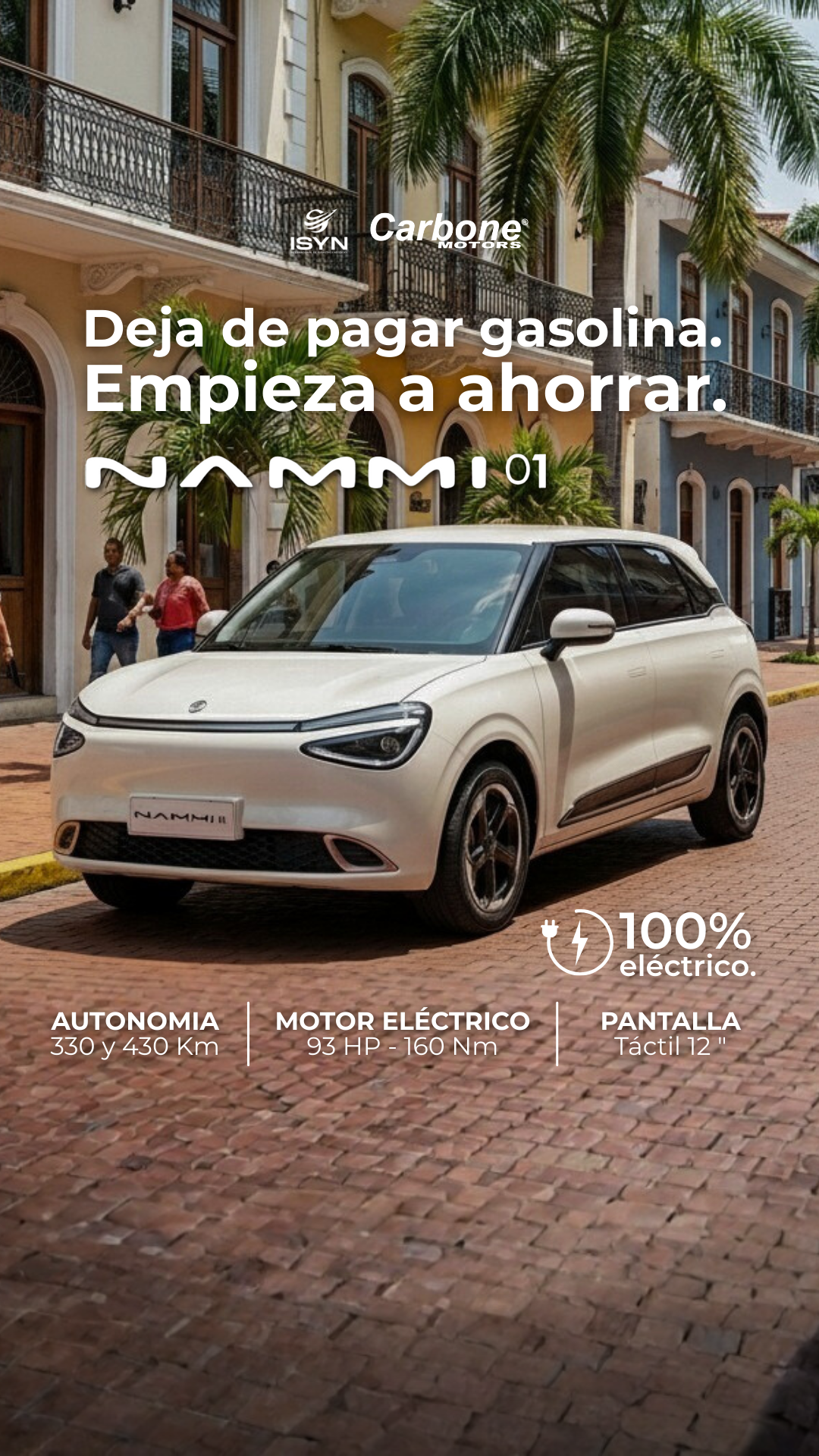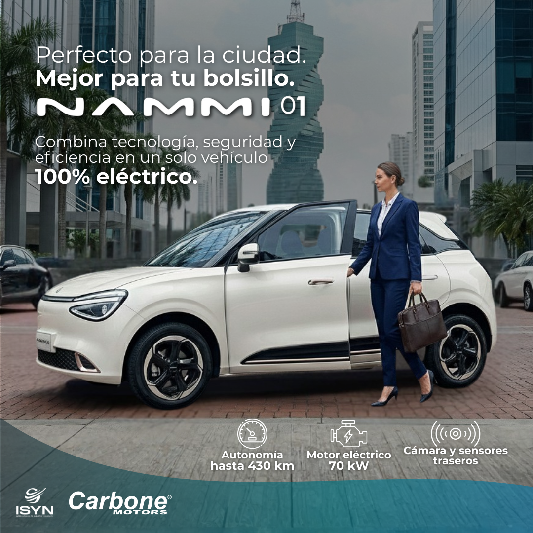 Carro eléctrico urbano El Nammi 01, diseño moderno (puertas sin marco, manijas retráctiles), buen espacio interior para ser un city car, tecnología (ADAS, pantalla táctil), opciones de autonomía (330-400 km).